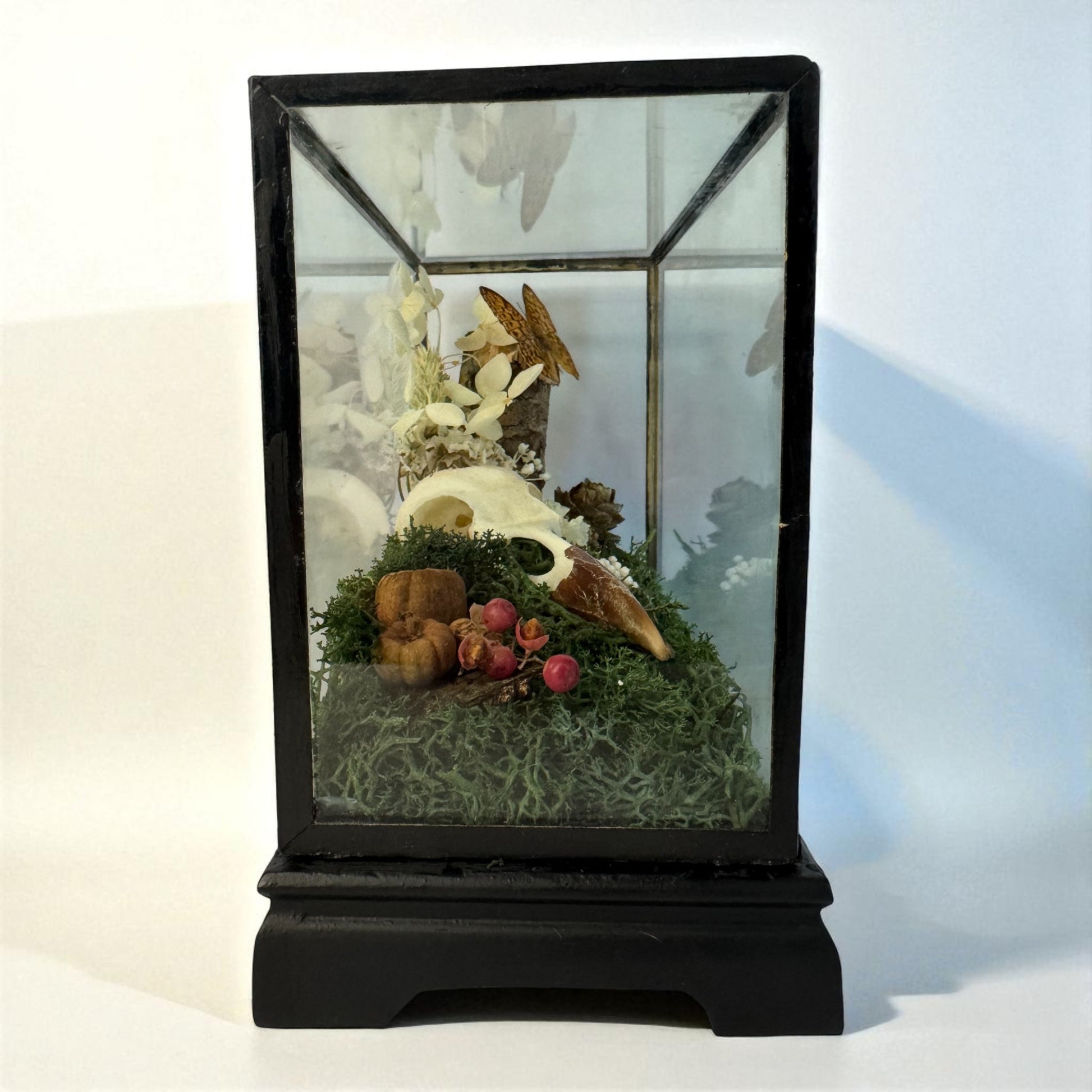 Real rabbit and Crow/Jackdaw skulls encased in a vintage wood and glass display case. Accented with preserved moss, pinecones and other real plant pieces and preserved butterflies.